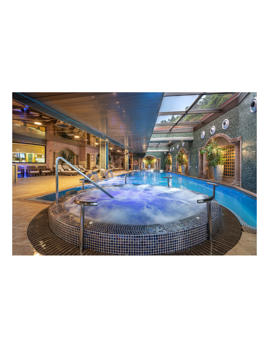 Circuito Spa para 2 personas. Duración 60 minutos: piscina climatizada con bancos lumbares, camas de agua, cascadas, jacuzzi, duchas de sensaciones, pediluvio, cueva de hielo, cueva de tumbonas con rayos infrarrojos, sauna finlandesa y hammam-baño de vapor.